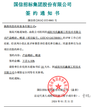 2024年1月31日,國信招標集團股份有限公司發(fā)來簽約通知書,陜西核昌機電裝備有限公司成功中標產(chǎn)品噴砂噴漆項目。自項目發(fā)布招標公告以來,核昌公司領(lǐng)導(dǎo)高度重視項目招投標工作,認真...