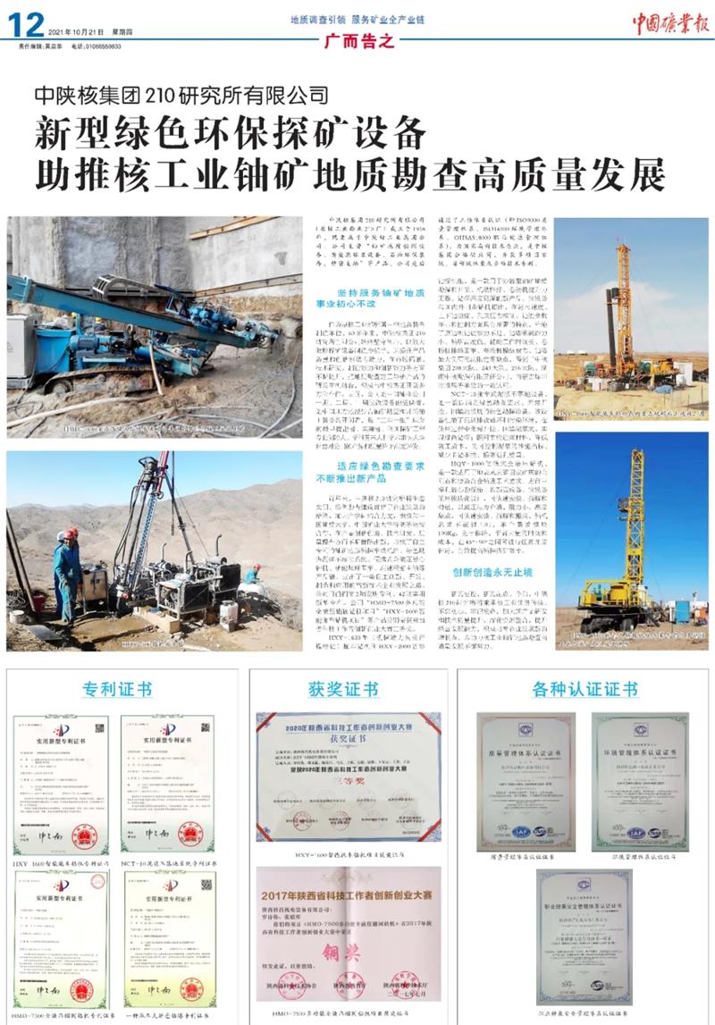 適應(yīng)綠色勘查要求不斷推出新產(chǎn)品。近年來(lái),中陜核210研究所將生態(tài)文明、綠色勘查建設(shè)貫穿于企業(yè)發(fā)展的始終,加大產(chǎn)學(xué)研結(jié)合力度,積極與中國(guó)地質(zhì)大學(xué)、中國(guó)礦業(yè)大學(xué)等高等院校進(jìn)行合作,在產(chǎn)品創(chuàng)新創(chuàng)造、技術(shù)研發(fā)、質(zhì)量提升方面不斷推陳出新,形成了自主專(zhuān)利的鈾礦地質(zhì)鉆探車(chē)載機(jī)組、綠色勘查泥漿不落地系統(tǒng)、便攜式全液壓巖心鉆機(jī)、新能源環(huán)衛(wèi)車(chē)、高速精密主軸等產(chǎn)品鏈,走出了一條自主創(chuàng)新、開(kāi)發(fā)、制造和應(yīng)用的高新技術(shù)企業(yè)發(fā)展之路。公司目前擁有2項(xiàng)發(fā)明專(zhuān)利、42項(xiàng)實(shí)用新型專(zhuān)利,公司“HMD-7500多功能全液壓錨固鉆機(jī)項(xiàng)目”“HXY-1600智能拖車(chē)鉆機(jī)項(xiàng)目”等產(chǎn)品分別榮獲陜西省科技工作者創(chuàng)新創(chuàng)業(yè)大賽三等獎(jiǎng)。